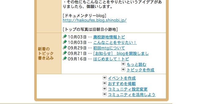 第1回のミーティングで集まって、それぞれやりたい事を言ってある程度まとまったので、当然のことながらMIXIコミュでの話題がなくなる。閑散とした状況だ。