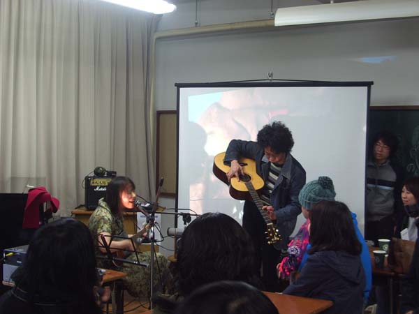 が、オープンしてからは人が増え、教室にはピースフルな雰囲気に包まれ、体育館のライブは盛り上がり、トラブルは何も起きずにスムーズに進む。途中から雨が降り出したけど、かえって人が校舎内に入ってくれたので、賑やかな雰囲気になって(屋台の人達にはすみません)。