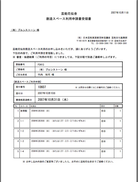 この一週間で入った芸能花伝舎の情報なんだけど、なんでも教室の使用は花伝舎の管理者である芸団協の会員団体が優先的に抑えられる。10/10からの第1次申請受付というのは、その会員団体が抑えた後の予約受付らしい。